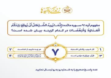 سؤال مسابقه پیامکی شماره (۷) «زندگی با آیهها» با محوریت مفهوم آیه ۹۱ سوره مائده و با ۱۰ جایزه یکمیلیونتومانی منتشر شد.