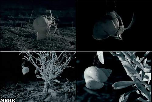 (از چپ به راست) عنکبوت کوچک در تصویر گوشه بالا سمت چپ کادر در حال پایین آمدن از بوته است، جاندار پس از اتصال تارش به پوسته صدف دوباره از همان تار بالا رفته و خود را به شاخه درخت میرساند