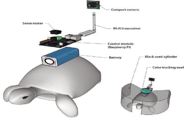 سیستمی که برای کنترل از راه دور لاک پشت ها بر روی پشت آنها نصب می شود متشکل از یک موتور، دوربین، گیرنده و فرستنده وای – فای، رایانه کوچک کنترلی و باتری است که برای شناسایی موانع و حرکت به سمت اهداف از قبل تعیین شده قابل استفاده است.