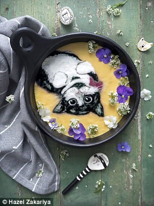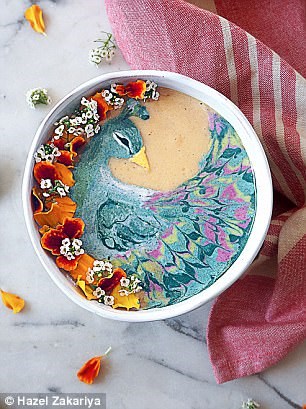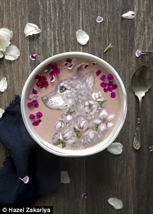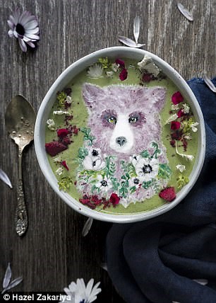 به نقل از dailymail ، هزل زکریا با یک خلاقیت بسیار زیبا نقاشی هایی را با مواد خوراکی همچون انبه، سیب، اسفناج، زغال چوب نارگیل ، ماست نارگیل...