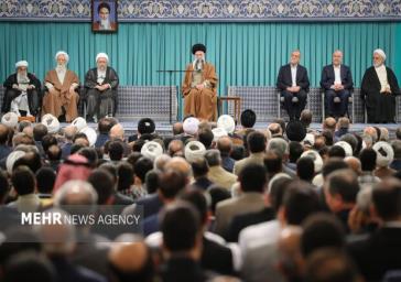 حضرت آیت‌الله خامنه‌ای در این دیدار با تبریک عید سعید و مبارک فطر به امت اسلامی و ملت ایران، این عید را یکی از نقاط اتصال دنیای اسلام به یکدیگر و موجب افزایش روزافزون عزت اسلام و رسول گرامی آن خواندند و گفتند: لازمه تحقق عزت روزافزون اسلامی، اتحاد و همت و بصیرت امت اسلامی است.