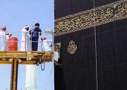 پرده جديد كعبه برابر با نهم ذيحجه به افق عربستان پس از شستشوی كعبه با گلاب ناب كاشان، بر بنای كعبه نصب می شود.