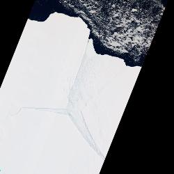 این تصویر ماهواره‌ای از لبه غربی "دندان لق" این غلاف یخی است، یک کوه یخ (آیسبرگ) عظیم که برای دهه‌‌ها است از غلاف اصلی در حال جدا شدن است (توجه داشته باشید که یخچال‌ها در واقع به طور ناگهانی در خطوط مستقیم در دو طرف از یکدیگر بریده نمی‌شوند- این خط مستقیم صرفا لبه عکس ماهواره‌ای است).