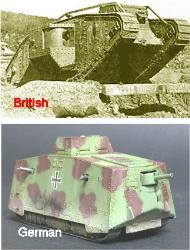24 آوریل 1918 جبهه ویلر برتونو (فرانسه، آخرین سال جنگ جهانی اول) شاهد نخستین نبرد تانک بود. در این نبرد 3 تانک آلمانی و 3 تانک انگلیسی یکدیگر را می کوبیدند. شمار کل تانکهای آلمان در زمان این نبرد، 21 دستگاه گزارش شده است. «تانک» به عنوان یک جنگ افزار در سال 1917 ساخته شده بود و قبلا ارتش انگلستان از آن در نبرد با افراد پیاده و سنگرنشین استفاده می کرد که آلمان نیز تانک به جبهه فرستاد. مهندس جوزف ولمر طراح تانکهای آلمان بود که از سال 1916 دست بکار آن شده بود. نخستین تانکهای آلمانی 30 تن وزن، اندکی بیش از هفت متر طول و 3 متر عرض داشتند، ضخامت زره آنها 5 سانتیمتر بود، مجهز به توپ 57 میلیمتری بودند و شبیه یک برجک پولادین بنظر می رسیدند. یک موتور دایملر این تانکها را به حرکت درمی آورد و حداکثر سرعت آنها 15 کیلومتر در ساعت بود. نخستین طراح تانکهای انگلیسی سرگرد ویلسون بود. این تانکها 28 تن وزن داشتند ولی سرعتشان بیش از 6 کیلومتر در ساعت نبود.