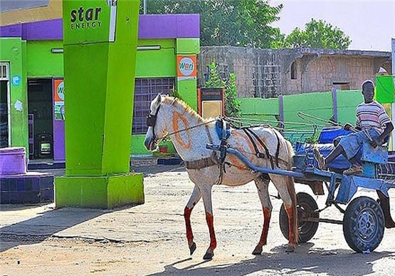 یک نوجوان با گاریاش در کنار یک پمپ بنزین در شهر سن ـ لویی در سنگال