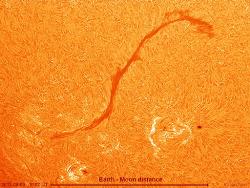 اگر با استفاده از یک تلسکوپ کوچک مجهز به فیلتر خورشیدی به سطح ستاره منظومه شمسی بنگرید، میتوانید این ساختار پلاسمایی عظیم را بر سطح خورشید مشاهده کنید که به اندازه فاصله زمین تا ماه درازا دارد.در این تصویر از ریچارد فلیت، میتوانید رشتهای معلق بر سطح خورشید را ببینید که بهدلیل داشتن میلیاردها تن پلاسما و تحت تاثیر میدان مغناطیسی، بر سطح نورکره خورشید شناور است. چند روزی هست که این پدیده بههمین شکل بر سطح خورشید دیده میشود و بعید به نظر میرسد که بتواند به همین وضع پایدار باقی بماند. در صورت سقوط این رشته مغناطیسی به سطح خورشید، یک ابرفوران اتفاق میافتد و انرژی زیادی آزاد میشود.