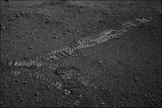 رد چرخهای کنجکاوی روی سطح مریخ که توسط یکی از دوربینهای این مریخ نورد گرفته شده است