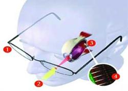 1ـ عينك سادهاي كه به باتري، ليزر منتقل كننده نيرو و لنز مجهز است كار اصلي انتقال نور به چشم نابينا و سيستم كارگذاشته شده در آن را به عهده دارد.