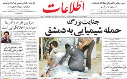مخالفان سوري از حمله شيميايي به مناطق مسکوني غوطه شرقي در حومه دمشق و کشته شدن بيش از 1000 تن و زخمي شدن هزاران تن ديگر خبر دادند. اين در حالي است كه شبكه الجزيره آمار كشته ها را 1600 تن اعلام كرد.