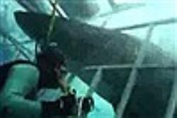 سر و کله یک کوسه سفید بزرگ از دور پیدا شده و با سرعتی بسیار نه تنها طعمه را می بلعد بلکه مستقیم به قفس می کوبد.