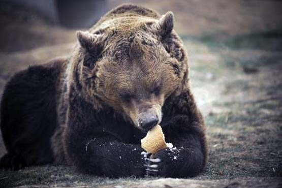 خرس در نزدیکی روستای مرامور در کوزوو تکه نانی را می خورد.