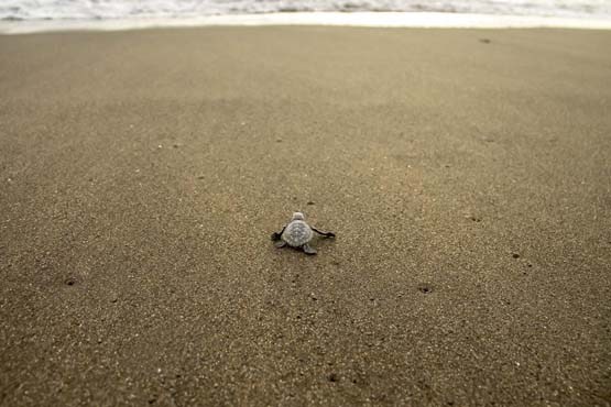 بچه لاک پشت دریایی در ساحلی در کاستاریکا از تخم درآمده و عازم اقیانوس است.