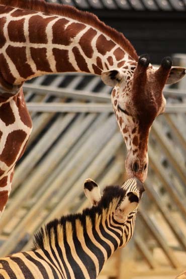 صحنه ای نادر از دوستی یک زرافه و یک گورخر در باغ وحش کالچستر انگلستان.
