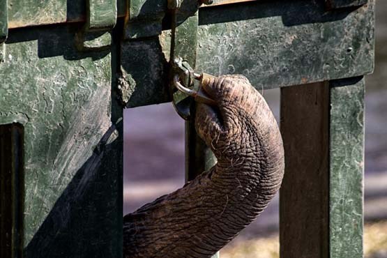 سوفیا فیل آسیایی پارک حیات وحش بیوپارکو شهر رم با خرطوم تلاش می کند قفل محل نگهداری اش را باز کند.