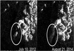 به گزارش سرویس علمی خبرگزاری دانشجویان ایران (ایسنا)، در ماه ژوئیه سال 2012، نوعی ویژگی عظیم به مساحت 260 کیلومتر مربع (تقریبا به اندازه 58 هزار زمین فوتبال) مشاهده شد که از زیر دریای مایع تیتان به سطح میآمد و دوباره ناپدید میشد.