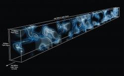 شرح عکس: الگوی سهبعدی شبکه کیهانی (تاروپود عالم در بزرگترین مقیاس) در فاصله 10.8 میلیارد سالنوری از زمین. عرض مکعب 2.5 میلیون نوری است. .