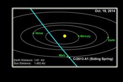 ساعت 21 و 59 دقیقه امشب به وقت ایران، دنباله دار سایدینگ اسپرینگ (C/2013A1) از 137 هزار کیلومتری سطح مریخ گذر خواهد کرد؛ یعنی سه برابر نزدیک تر از ماه به زمین! این اولین باری است که بشر شاهد گذر یک دنباله دار 700 متری از فاصله ای به این نزدیکی از کنار یک سیاره است.