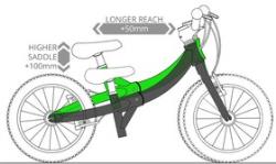 قاب اصلی دوچرخه با اعمال برخی تغییرات، میتواند تا 30 سانتیمتر بزرگتر شود؛ ارتفاع زین حدود 10 سانتیمتر و فاصله زین تا فرمان نیز 4.82 سانتیمتر بیشتر میشود.