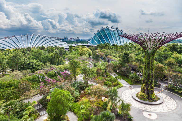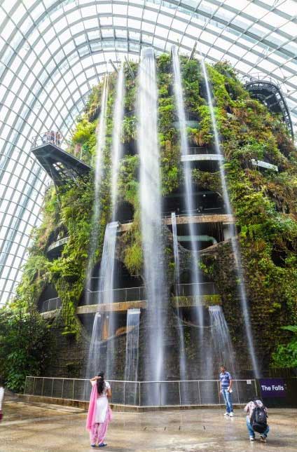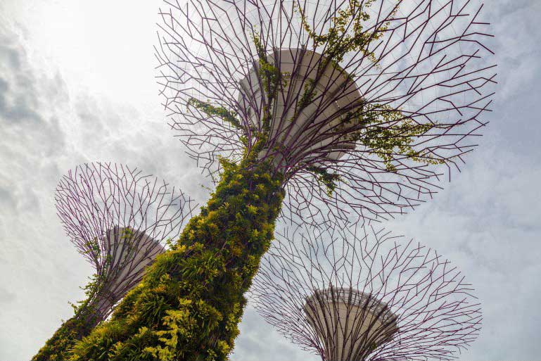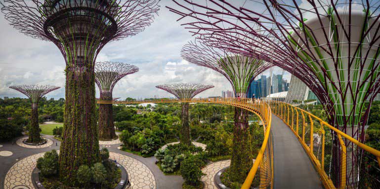 درختان «Supertree Grove» شامل مجموعه ای از درختان سایبورگی غول پیکر و جنگل ابرها یک مکان گنبد مانند غول پیکر است که محیط زیست و آب و هوای کوهستانی را باز آفرینی کرده است. همچنین این مکان دارای بزرگ ترین آبشار داخلی در جهان است.