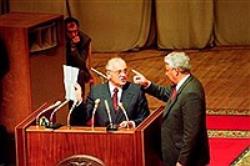 توضیح عکس، گورباچف را لحظه ای پیش از ایراد آخرین پیامش که از رادیو - تلویزیون پخش شد نشان می ‌دهد که یلتسین به او می گوید که به صراحت بگوید که دیگر " اتحاد شوروی " وجود خارجی ندارد!