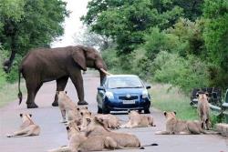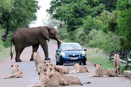 به نظر شما آیا راننده این خودرو باعث ترافیک جاده شده است یا از بدشانسی اش بوده است؟ اما باید یکی از آنها حق تقدم را رعایت کنند فیل، شیرها یا راننده بدشانس.
